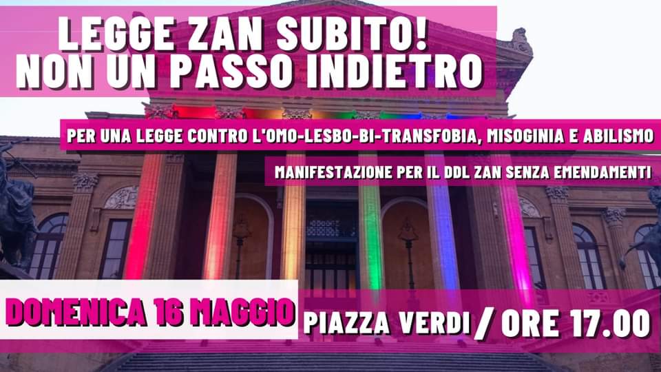 Manifestazione per la legge Zan senza emendamentiArcigay Palermo, Famiglie Arcobaleno, Ali d’Aquila, Agedo Palermo e il Coordinamento Palermo Pride invitano la città a scendere in piazza domenica 16 maggio alle ore 17 a piazza Verdi (teatro Massimo) per chiedere a gran voce l’approvazione del DDL Zan subito e senza modifiche.