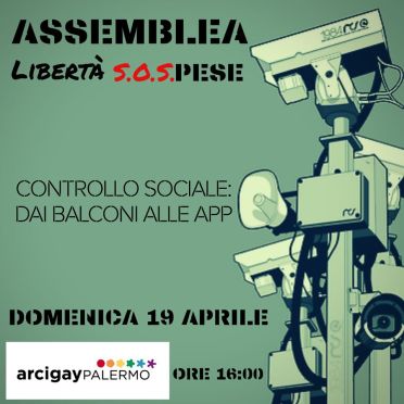 Continuiamo il nostro percorso con le assemblee a distanza di Arcigay Palermo: anche oggi pomeriggio saremo insieme per riflettere, condividere e confrontarci sul periodo che viviamo e sui problemi che emergono. Il tema di questa settimana sarà il controllo sociale: una riflessione sul rispetto delle regole, il controllo, gli allarmi, le accuse e gli strumenti di controllo.