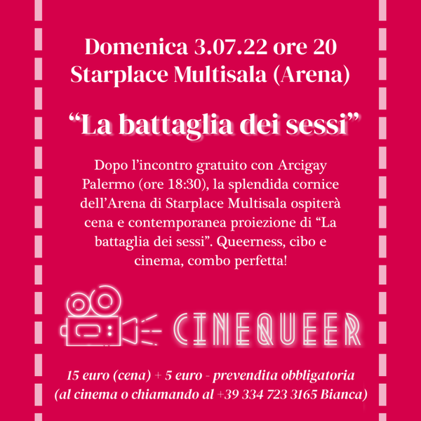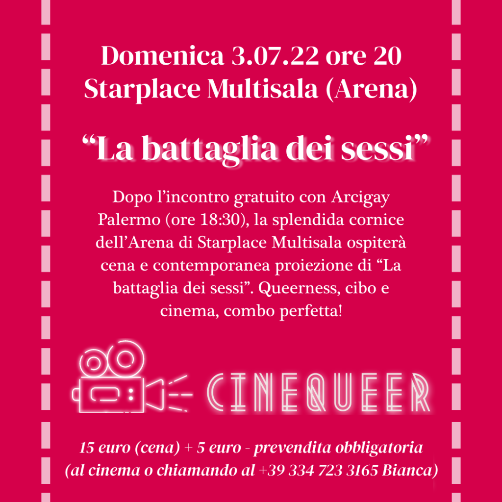 Il 3 luglio ci saremo anche noi, con un incontro sul Pride e, a seguire, il film “La battaglia dei sessi” . Appuntamento alle 18.30 allo Starplace multisala
