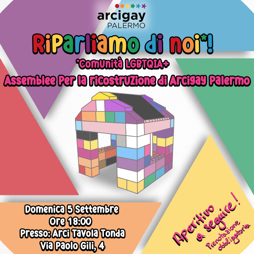 Riparliamo di noi, dei nostri desideri, delle nostre aspirazioni, dei nostri bisogni ed obiettivi per il futuro attraverso un percorso di assemblee aperte per definire collettivamente le priorità e le attività di Arcigay Palermo per i prossimi anni.