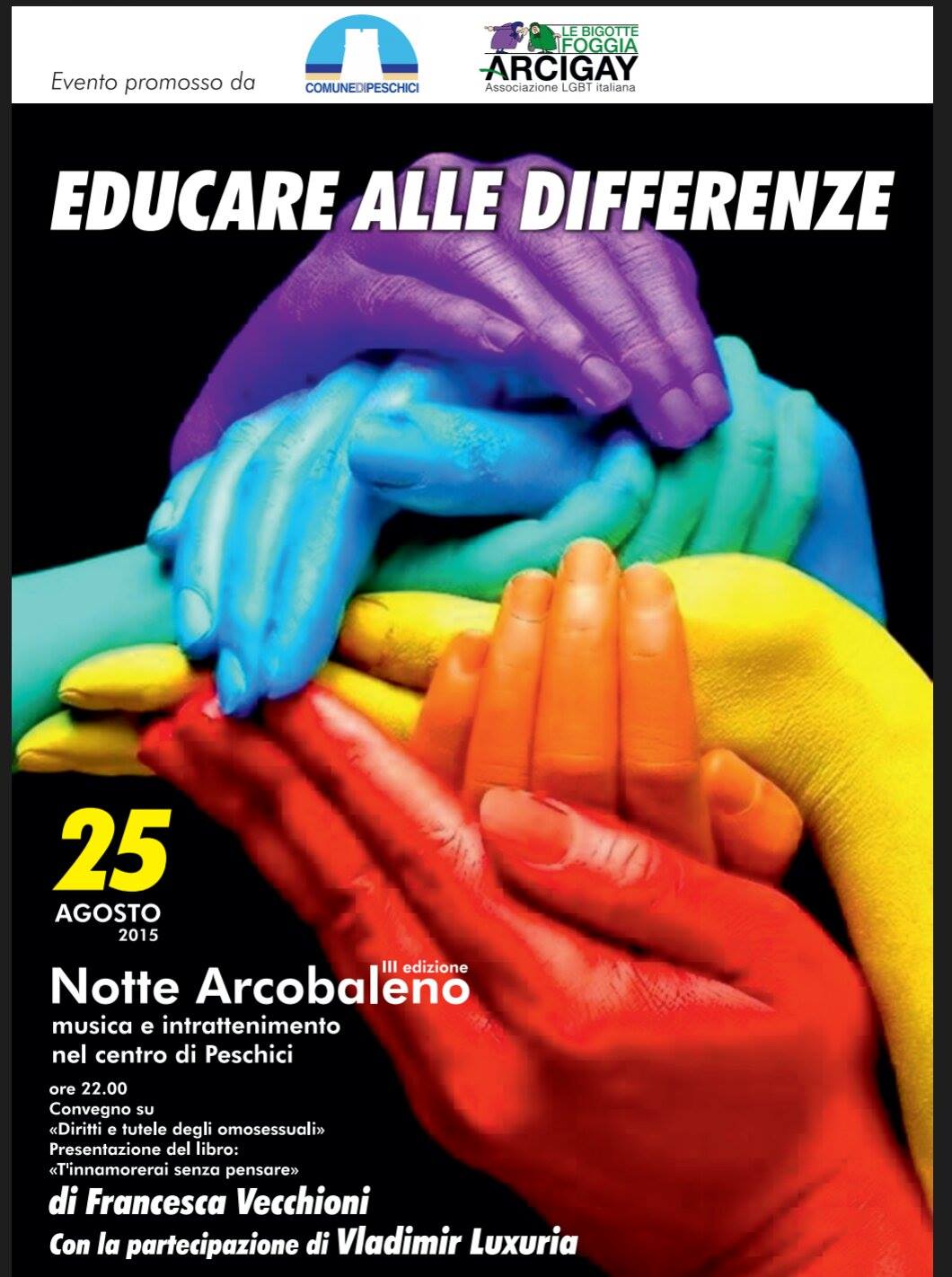 Terza edizione a Peschici per la Notte arcobaleno, l’evento promosso dall’Amministrazione Comunale di Peschici (Fg) in collaborazione con il Puglia Pride e Arcigay Foggia ‘Le Bigotte’. Appuntamento il 25 agosto con una notte di musica ed appuntamenti contro le discriminazioni delle persone gay, lesbiche e trans. Nel bellissimo scenario della città gioiello del Parco nazionale del Gargano arriveranno Francesca Vecchioni, autrice per Mondadori del libro “T’innamorerai senza pensare”, e Vladimir Luxuria: saranno loro ad animare, dalle 22, il convegno “Diritti e tutele degli omosessuali”, in programma nel centro cittadino. L’evento è a ingresso libero.