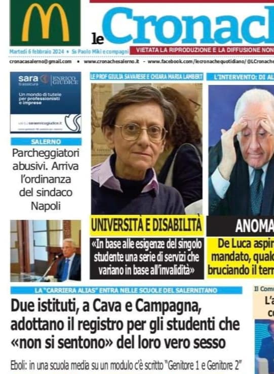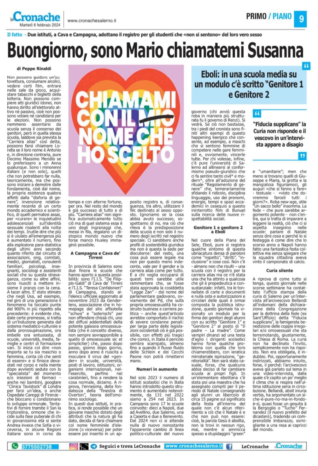 “Riteniamo che le parole utilizzate nell’articolo, la modalità con la quale il tema viene trattato e le argomentazioni esposte siano profondamente offensive ed escludenti, non rispettose né delle persone trans*, né della comunità scolastica né tantomeno della verità e della complessità della questione trattata. Così Rocco Del Regno, Presidente di Arcigay Salerno. Ci sembra irrispettoso un linguaggio che affronti la condizione delle persone trans* , al netto delle opinioni personali, con un linguaggio svalutante, direi “macchiettistico”, e termini tendenziosi che lasciano intendere che la condizione trans* sia un “sentire”, che esista un “vero” ed un “falso” sesso, che confonde l’identità di genere con quella sessuale, che mescola e sovrappone questioni diverse per affermare un pensiero discriminatorio – continua Rocco Del Regno. Per questo abbiamo ritenuto di contattare e chiedere un intervento tempestivo dell’Ordine dei Giornalisti della Campania. Il ruolo dei media, infatti, è prezioso e fondamentale nella diffusione di linguaggi inclusivi e informazioni corrette. Riteniamo che la professionalità della categoria di chi opera nell’informazione sia profondamente lesa. Le Cronache, il suo Direttore, la redazione tutta, dovrebbero chiedere scusa alla comunità lgbtqia+ e a tutte le persone che ogni giorno leggono il quotidiano e si sono ritrovate a leggere un articolo scorretto, tendenzioso, strumentale e offensivo non solo delle persone trans* ma di ogni persona di buon senso – conclude Rocco Del Regno”.