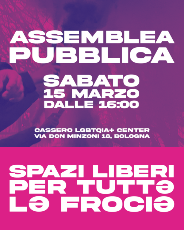Dopo la partecipatissima assemblea del 6 febbraio al Cassero, e la manifestazione antifa del 15 febbraio, il movimento LGBTQIA+ antifascista, transfemminista e antirazzista prosegue il percorso di convergenza e di elaborazione incontrandosi in una seconda assemblea pubblica sabato 15 marzo alle 16.00 al Cassero in via Don Minzoni 18* .