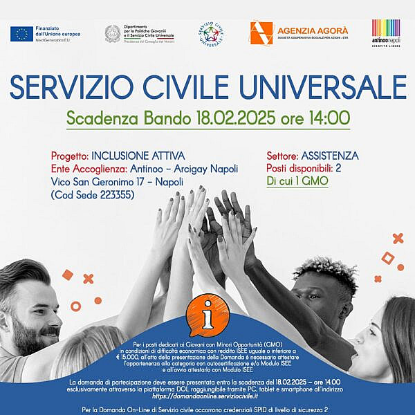 Articolo tratto da https://www.arcigaynapoli.org/2025/01/23/bando-per-la-selezione-due-volontari-e-presso-antinoo-arcigay-napoli-da-impiegare-in-progetti-di-servizio-civile-universale-scadenza-18-febbraio-2025-ore-14-00/