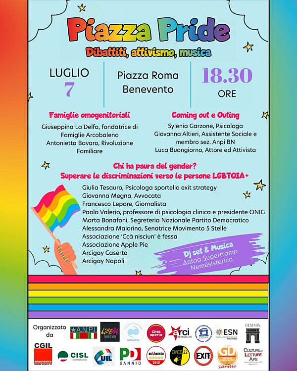 Benevento, Piazza Pride, 7 luglio dalle ore 18:30: dibattiti, attivismo e musica