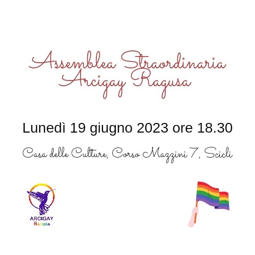 È convocata L’Assemblea Straordinaria delle persone associate dell’associazione Arcigay Ragusa presso la sede di Arcigay Ragusa a Casa delle Culture in Corso Mazzini 7, Scicli.