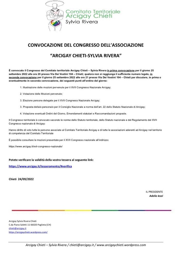 È convocato il Congresso del Comitato territoriale Arcigay Chieti – Sylvia Rivera in prima convocazione per il giorno 25 settembre 2022 alle ore 20 presso Via Dei Vestini 104 – Chieti; qualora non si raggiunga il sufficiente numero legale, in seconda convocazione per il giorno 25 settembre 2022 alle ore 21 presso Via Dei Vestini 104 – Chieti per discutere, in prima o eventualmente in seconda convocazione, dei seguenti punti all’ordine del giorno: