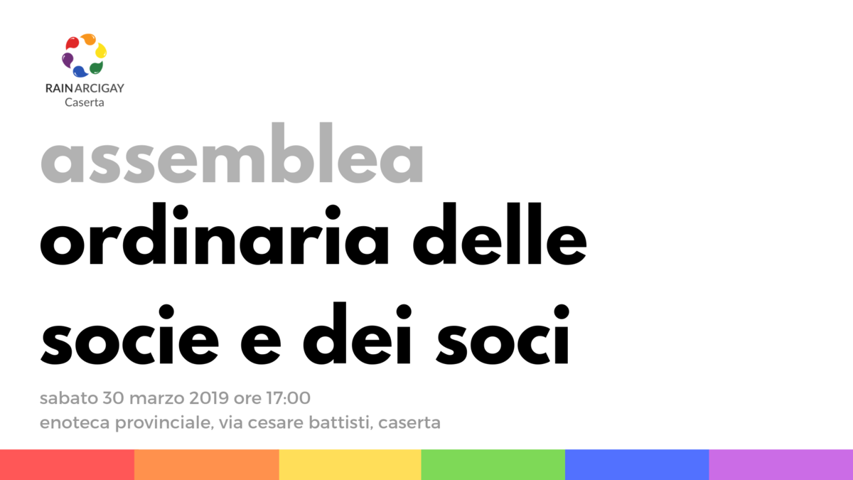 l’assemblea ordinaria delle socie e dei soci nonché dei volontari e delle volontarie di Rain Arcigay Caserta onlus per il giorno sabato 30 marzo 2019, in prima convocazione alle ore 16:30 e in seconda convocazione, qualsiasi sia il numero dei partecipanti, alle ore 17:00 presso l’Enoteca Provinciale, via Cesare Battisti, Caserta. (La sede dell’assemblea potrebbe variare, fare attenzione a successivi avvisi)