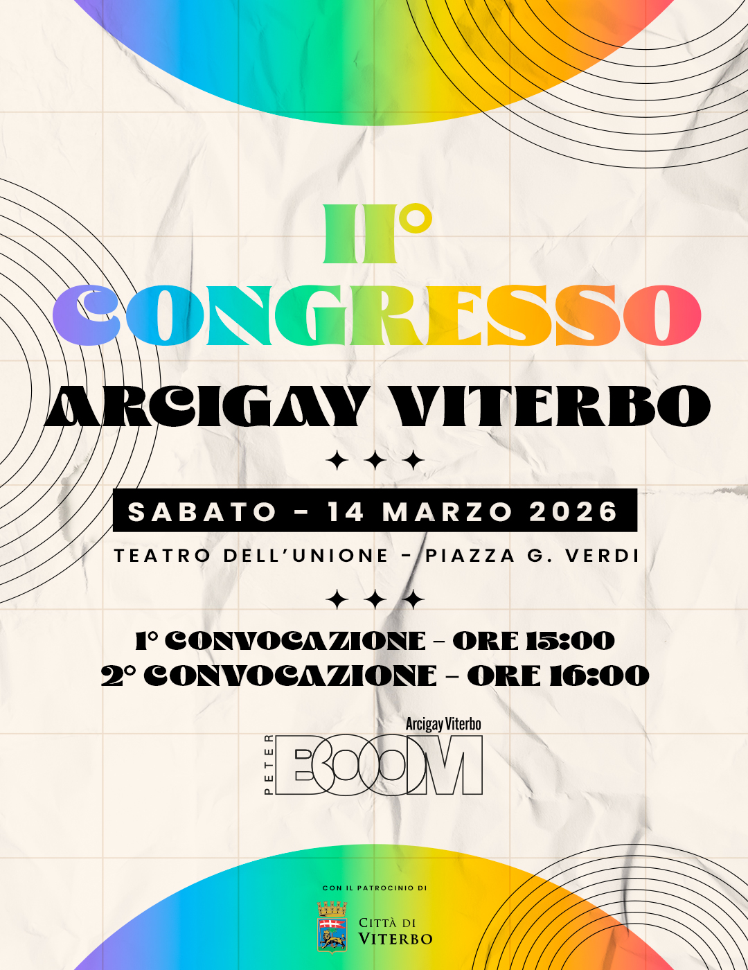 Il Consiglio Direttivo rende noto alle persone associate che è convocato il Secondo Congresso dell’Associazione Arcigay Viterbo – Peter Boom APS presso il Foyer del Teatro dell’Unione di Viterbo, con il seguente calendario: