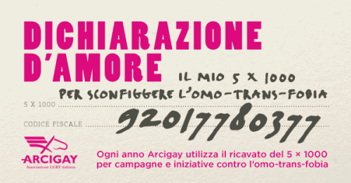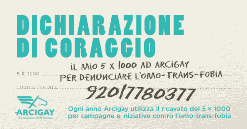 Arcigay è una delle associazioni cui è possibile donare il proprio 5×1000. Per farlo è sufficiente firmare e scrivere il codice fiscale di Arcigay, 92017780377, nel riquadro riservato alle associazioni (il primo in alto a sinistra) dell’apposita scheda. La scheda è allegata ai modelli 730, Unico o Cud. Se non ti viene consegnata, puoi richiederla al tuo datore di lavoro o al tuo ente pensionistico (Inps, ecc.). Se fai il 730 o l’Unico devi presentare la scheda compilata insieme al modello. Se invece non fai la dichiarazione dei redditi e ricevi il modello Cud, devi consegnarla in busta chiusa, entro il 1° agosto, in posta, in banca, o ad altro intermediario abilitato (commercialista, Caf, ecc.).