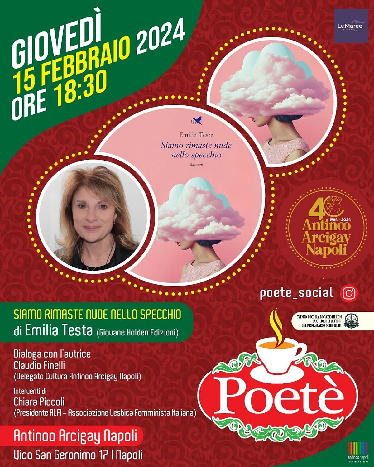 Giovedì15 febbraio, alle ore 18,30, presso la storica sede dell’associazione Antinoo Arcigay Napoli, in vico San Geronimo 17, la rassegna letteraria Poetè, ideata e diretta da Claudio Finelli, ospita SIAMO RIMASTE NUDE NELLO SPECCHIO, romanzo di Emilia Testa, edito dalla Giovane Holden Edizioni