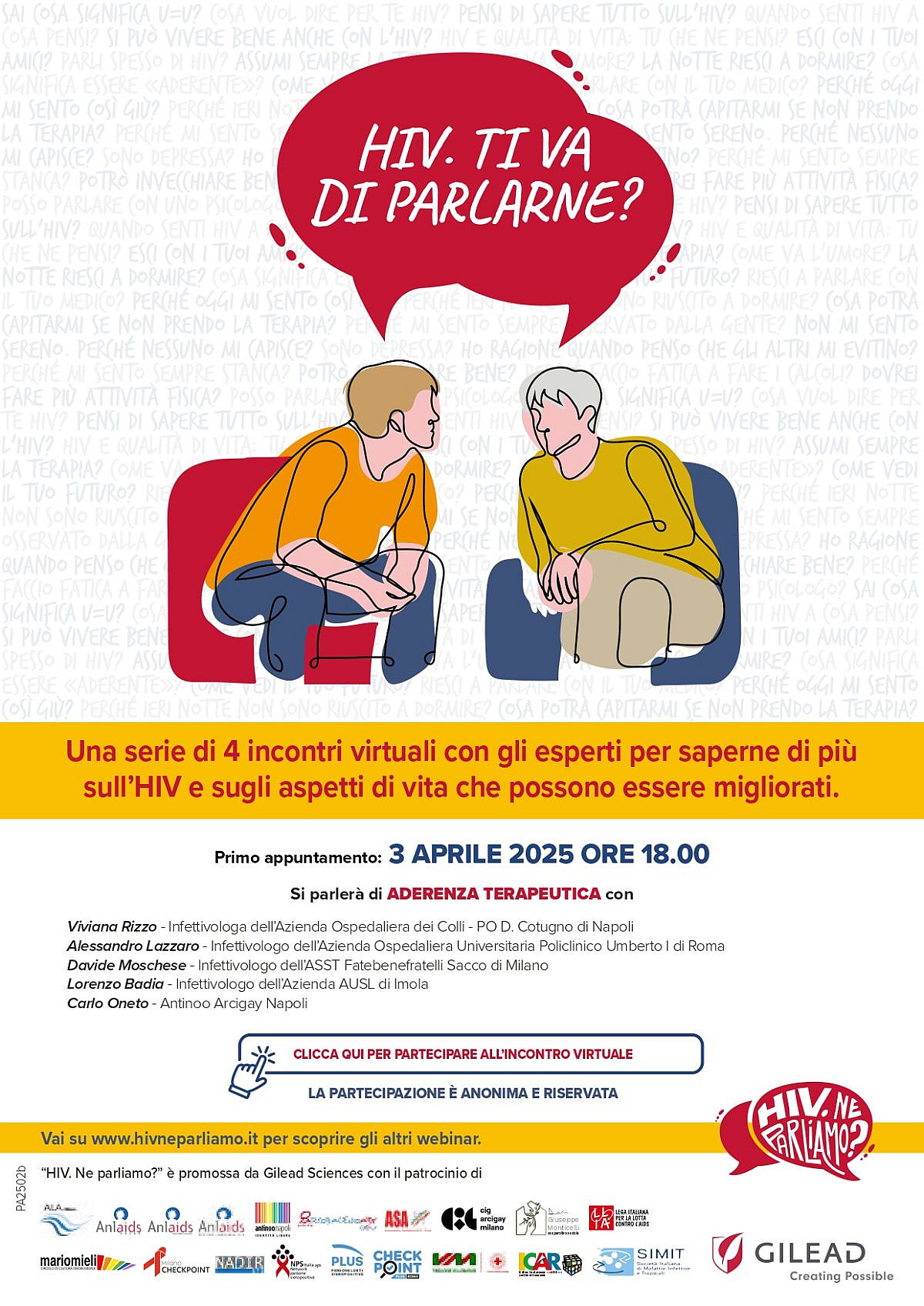 “HIV. Ti va di parlarne?” E’ un progetto promosso da Gilead Sciences, con il patrocinio tra gli altri anche di Antinoo Arcigay Napoli, finalizzato alla salute e al benessere sessuale e che tratta di argomenti inerenti la vita con HIV e che possono suscitare interesse su un pubblico più ampio. Il 03/04/2023 alle 18.00 ci si potrà collegare anonimamente (e gratuitamente) cliccando il link sulla locandina. Nel primo dei 4 webinar, l’argomento trattato sarà l’importanza dell’aderenza alle terapie e le strategie per mantenerla, a parlare ci saranno dei clinici e dei pazienti con la loro esperienza. Sarà possibile fare domande via chat. Gli altri incontri, di cui a seguito pubblichiamo le locandine, riguarderanno il benessere psicologico e la salute sessuale pelle persone che vivono con HIV.