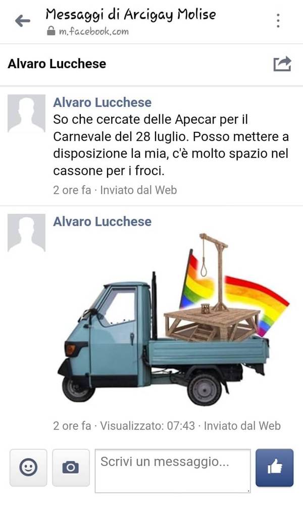 Il messaggio è apparso sia tra i messaggi ricevuti dalla pagina Arcigay Molise, che pubblicamente in un post: https://www.facebook.com/ArcigayMolise/posts/880589752130784
