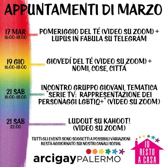 Tornano gli incontri del Gruppo Giovani (Under 30) e del Gruppo Trans di Arcigay Palermo, l’appuntamento mensile di LUDOUT (serata LGBTIQ+ NERD) e raddoppia l’appuntamento con l’ora del tè in Arcigay Palermo (tutti i giovedì e da ora anche tutti i martedì).