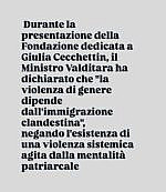 Siamo sconcertate dalle parole di un Ministro che anziché fare prevenzione nelle scuole istituendo percorsi stabili di educazione sessuale e affettiva, continua a sminuire la violenza di genere attraverso parole razziste.