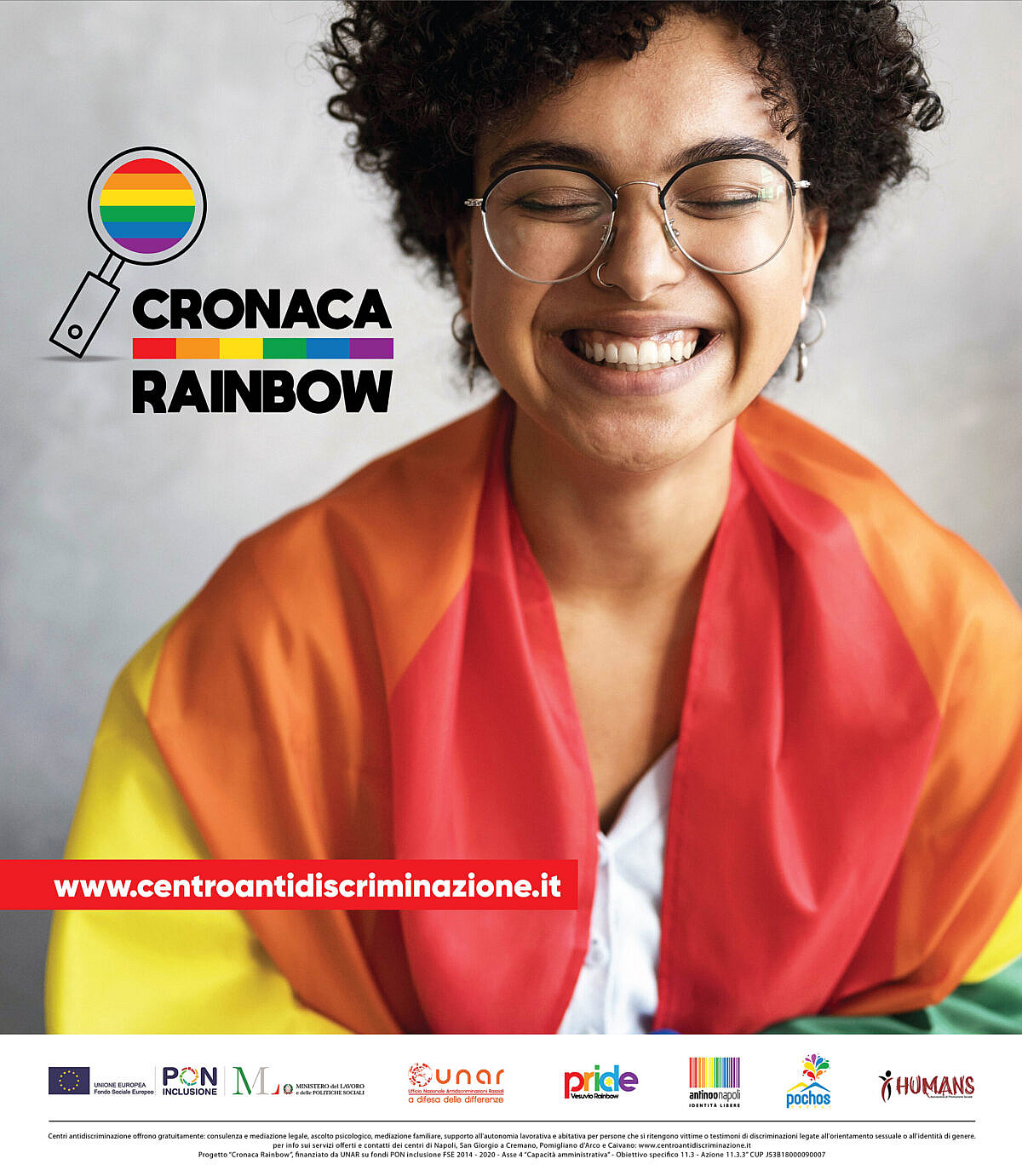 Cronaca Rainbow è un progetto realizzato da un partenariato di associazioni con capofila Pride Vesuvio Rainbow ed è stato finanziato da UNAR (Ufficio Nazionale Antidiscriminazioni Razziali) della Presidenza del Consiglio dei Ministri, su fondi dell’Unione Europea (PON/FSE) e mira a far conoscere alla cittadinanza i servizi offerti dai centri antidiscriminazione di Napoli, San Giorgio a Cremano, Pomigliano d’Arco e Caivano. I Centri antidiscriminazione (CAD) UNAR sono nati, su modello dei Centri antiviolenza (CAV) da poco più di un anno e offrono consulenza e sostegno alle persone che subiscono o sono testimoni di discriminazioni, in particolar modo quelle legate all’orientamento sessuale o all’identità di genere. I centri antidiscriminazione hanno lo scopo di promuovere e realizzare il diritto alla parità e alla non discriminazione, nonché il principio della pari dignità delle persone e rappresentano un presidio civico nel contrasto all’omofobia, alla transfobia ed agni forma di discriminazione o violenza di genere. Offrono gratuitamente alla cittadinanza supporto legale, psicologico e socio-sanitario ed un eventuale aiuto concreto nella costruzione di percorsi di autonomia lavorativa o abitativa. Sono attive inoltre delle linee whatsapp o telefoniche “amiche”. Quattro i centri interessati dal progetto “Cronaca Rainbow”: La Casa delle Culture e dell’Accoglienza delle persone LGBTQIA+ di Napoli, che offre anche accoglienza a persone LGBT+ (Lesbiche, Gay, Bisessuali e Trans) in emergenza abitativa e vittime di discriminazione o violenza, il Pride Center con il Comune di San Giorgio a Cremano, Codice Rainbow con il Comune di Caivano e il CAD di Pomigliano d’Arco.