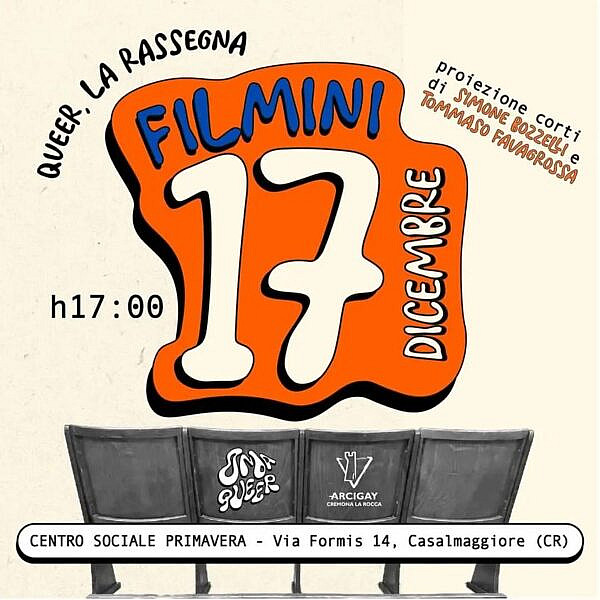 Domenica 17 dicembre ore 17.00Centro Primavera via Formis 14 – Casalmaggiore Insieme a OndaQueer inauguriamo la serata Filmini, con la proiezione dei cortometraggi prodotti da Simone Bozzelli e Tommaso Favagrossa Gli autori saranno con noi durante la serata per presentarci il loro lavoro e spiegarci l’importanza del cinema queer per la nostra comunità
