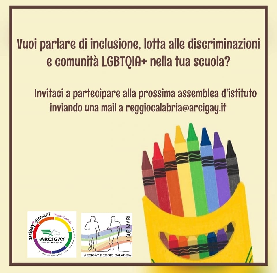 Il Gruppo Scuola del comitato Arcigay Reggio Calabria nasce nel 2010 e negli anni ha realizzato numerosi progetti educativi, formazioni specifiche, laboratori contro le discriminazioni e molto altro.