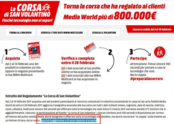 E’ quanto recita il volantino promozionale di Media World, la catena italiana di distribuzione tecnologica: “Ciascun vincitore avrà 100 secondi a disposizione per correre all’interno del punto vendita Media World designato e afferrare tutta la tecnologia che desidera, ma dovrà concorrere “in coppia” ossia insieme ad un Partner di Gara, da lui scelto, purché maggiorenne e di sesso opposto al proprio”. Le associazioni lgbt hanno denunciato la discriminazione invitando a boicottare i negozi Media World. Gabriele Piazzoni, segretario nazionale Arcigay commenta: “Dopo 30 anni per farci riconoscere dallo Stato, non pensavamo ci volesse più tempo per farsi riconoscere da una catena commerciale, la differenza però è che cittadini italiani ci siamo nati, clienti Media World no. O cambiano il regolamento o noi cambieremo negozi”, conclude Piazzoni.