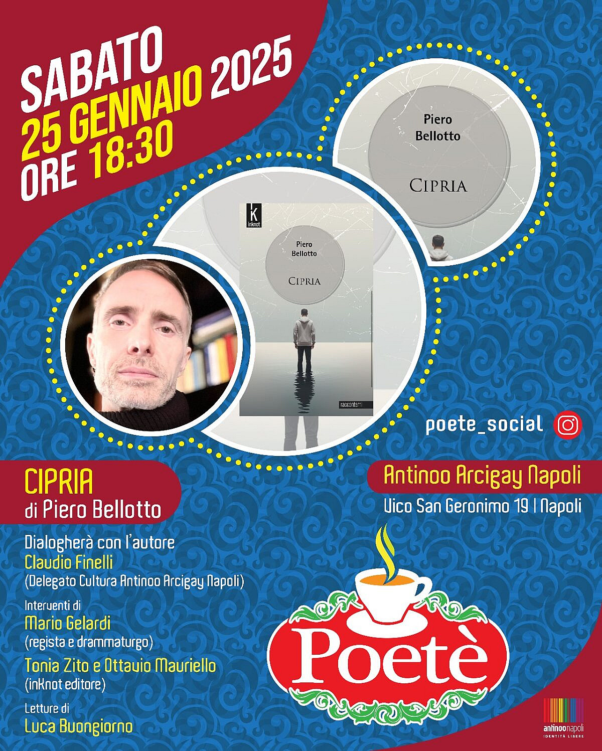 Dialogherà con l’autore Claudio Finelli, delegato cultura Antinoo Arcigay Napoli. Sabato 25 gennaio 2025, alle ore 18:30, presso la storica sede dell’associazione Antinoo Arcigay Napoli, in vico San Geronimo 17, torna la rassegna letteraria Poetè, ideata e diretta da Claudio Finelli e giunta al suo 16° anno di vita, con il romanzo Cipria di Piero Bellotto (inKnot Editore).