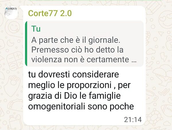 Il profilo WhatsApp di Daniele reca i riferimenti commerciali e pubblicitari del bistrot Corte77 2.0 che su google attesta di avere tra i punti di forza l’essere locale LGBTQ+ friendly. Come è possibile che un locale che si dichiara a favore delle persone LGBTQ+ possa immaginare di dire pubblicamente che per grazia di Dio le famiglie omogenitoriali sono poche? Bisogna quindi limitarle? Se diventano troppe allora è il caso di trovare un modo per ridurle? Quale? La cancellazione fisica?