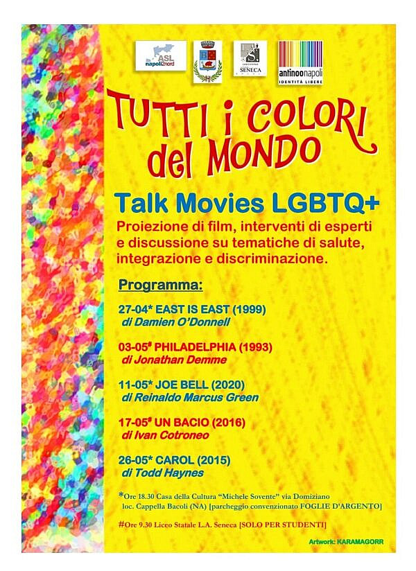 “Tutti i colori del mondo” è un programma articolato, con un calendario di proiezioni di pellicole cinematografiche e di relativi incontri con esperti che si terranno presso la “Casa della Cultura – Michele Sovente” di Cappella (Bacoli), da partire dal 27 Aprile 2023, e che hanno una finalità preventiva dal duplice aspetto, da un lato per combattere la discriminazione per i diversi orientamenti sessuali e la difesa dell’identità di genere e poi, dall’altro, per sensibilizzare la cittadinanza sul tema della riduzione dell’incidenza delle malattie sessualmente trasmissibili.