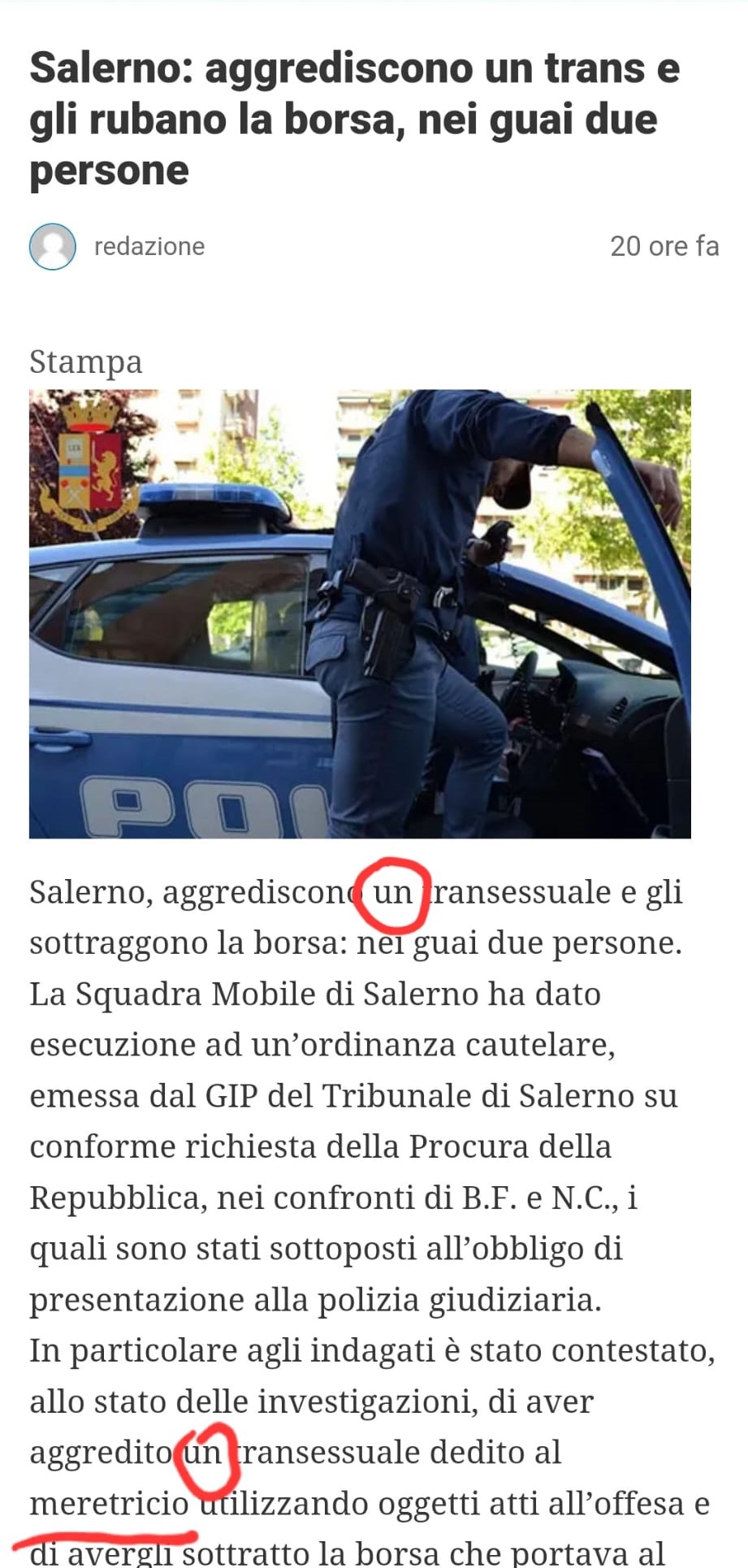 [:it]Una persona Trans aggredita a Salerno. Rocco Del Regno (Arcigay Salerno):”Ancora crimini d’odio contro le persone trans*. A queste violenze si aggiunge un linguaggio scorretto e discriminatorio della stampa e delle forze dell’ordine. Chiediamo più rispetto, tutele e attenzione alla nostra comunità”.
