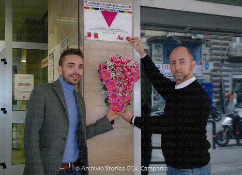 Le associazioni LGBT napoletane I-ken,Arcigay Napoli, Arcilesbica e ATN insieme alla CGILCampania e alla Camera del Lavoro di Napoli, hanno posto questa mattina, una corona di tulipani rosa sotto la targa, affissa all’ingresso della sede della CGIL in via Torino a Napoli, per ricordare le vittime delle persecuzioni sugli omosessuali. “La commemorazione di questa giornata, in memoria dello sterminio e delle persecuzioni che hanno subito, a causa delle leggi razziali il popolo ebraico, la popolazione dei Rom e dei Sinti, i portatori di disabilità , gli omosessuali e transessuali – dichiara il segretario generale della Camera del lavoro di Napoli, Federico Libertino – rappresenta per noi l’impegno a far vivere, senza distinzione di razza, sesso e orientamento politico, i valori di solidarietà e dignità di ognuno”. “Questa giornata che ricordiamo insieme alle associazioni Lgbt del territorio, innanzi alla targa che abbiamo deposto l’anno scorso proprio per ricordare l’omocausto – sottolineano in una nota le segreterie Cgil Campania e Napoli – vuole essere per tutti, l’invito a costruire insieme una società migliore che rigetti e contrasti l’indifferenza e ogni fenomeno di discriminazione”.