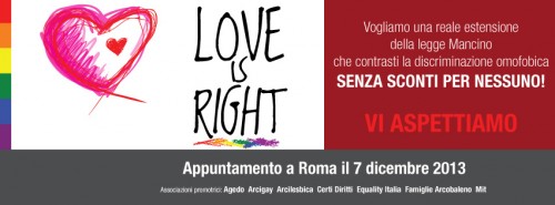 Bologna, 3 dicembre 2013 – Visto lo stallo delle istanze lgbt nel dibattito politico italiano, aggravato dal silenzio delle istituzioni del nostro Paese dinanzi alle condotte anti-gay messe in campo in territori prossimi al nostro, numerose associazioni che compongono il movimento lgbt (Arcigay, Arcilesbica, Agedo, Famiglie Arcobaleno, M.i.t., Associazione radicale “Certi diritti”, Equality Italia) hanno indetto per sabato 7 dicembre 2013 a partire dalle 15 una manifestazione nazionale a Roma, in piazza dei Santi Apostoli, dal titolo “Love is right”.