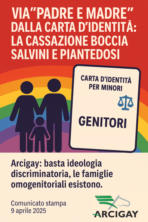 Bologna, 9 aprile 2025 – “Lo diciamo da anni: Matteo Salvini, autore del decreto che impone l’indicazione obbligatoria di ‘padre e madre’ nei documenti dei minori, è un ministro omofobo e razzista, inadeguato a ricoprire un ruolo istituzionale. Oggi arriva l’ulteriore conferma dalla Cassazione”: lo dichiara Gabriele Piazzoni, segretario generale di Arcigay.