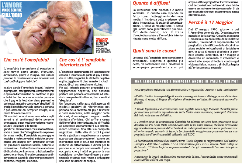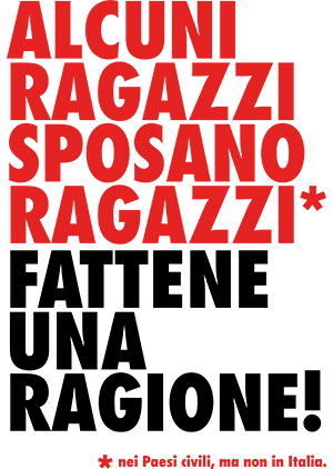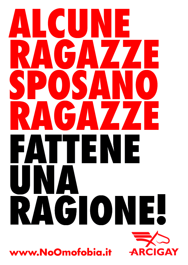 Campagna nazionale di affissioni pubbliche di Arcigay, in collaborazione con Arci, Rete degli Studenti Medi, ArciLesbica, Agedo, Famiglie Arcobaleno, Associazione radicale Certi Diritti, Rete Lenford, Dì Gay Project, 3D e GayLib, e diffusione di un volantino (fronte e retro).