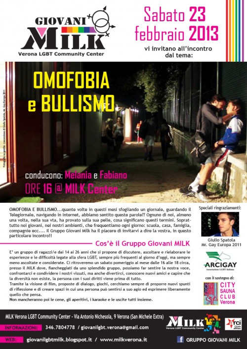 OMOFOBIA E BULLISMO…quante volte in questi mesi sfogliando un giornale, guardando il Telegiornale, navigando in Internet, abbiamo sentito queste parole?? Ognuno di noi, almeno una volta, nella sua vta, ha provato sulla sua pelle, cosa significano questi termini. Soprattutto noi giovani, nei nostri ambienti, che frequentiamo ogni giorno: scuola, casa, famiglia, compagnie ecc…. Il Gruppo Giovani Milk ha il piacere di invitarvi a dire la vostra, in questo particolare incontro!! Conducono Fabiano e Melania. PER INFO: [email protected] o 3467804778!!