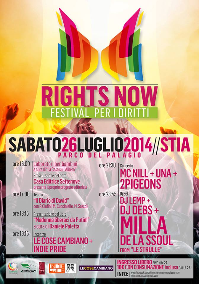 Teatro, workshop per bambini, presentazioni di libri, tanta musica dal vivo e dj set sono gli ingredienti della prima edizione di RIGHTS NOW, il Festival per i diritti in programma a Stia (AR) sabato 26 luglio. Evento promosso da Arcigay Arezzo “Chimera Arcobaleno”, Indie Pride – Indipendenti contro l’omofobia, Le Cose Cambiano e Teatro della Lana, il nuovo spazio culturale del Casentino, per combattere ogni forma di omofobia attraverso lo strumento della musica e delle arti.
