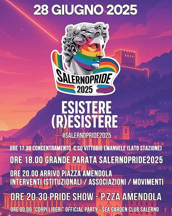 Salerno Pride 2025 aims to place the issues of rights and equality back at the center of local public debate, starting with democratic, constitutional, anti-fascist, and anti-racist principles and values. To this end, we once again call on local governments to promote municipal police regulations that limit the use of public spaces by organizations and demonstrations that invoke ideologies and content contrary to democratic and anti-fascist principles.