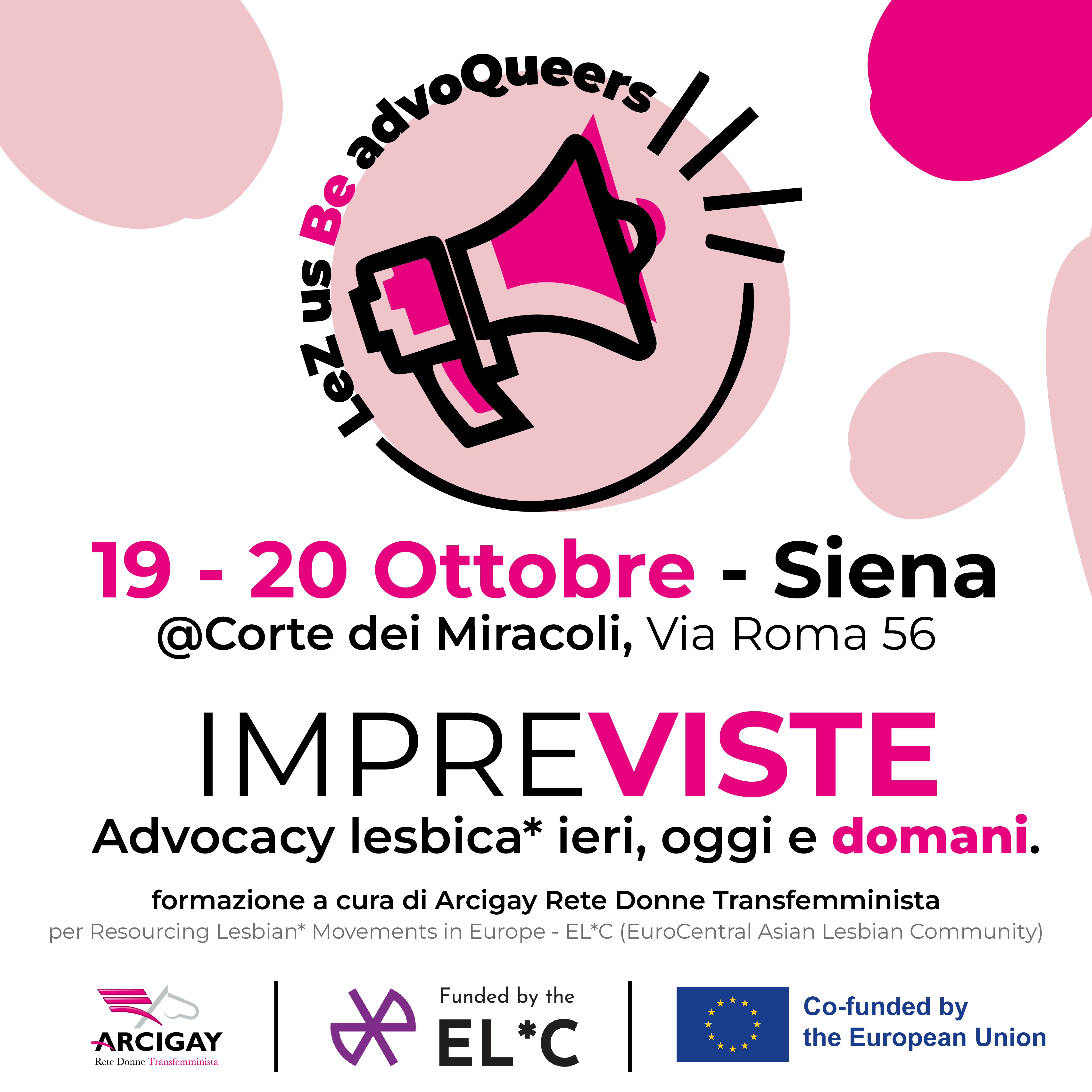 “Let Us Be AdvoQueers: a lezione di advocacy in Arcigay Rete Donne Transfemminista”: progetto di Arcigay Rete Donne Transfemminista, finanziato da the EuroCentralAsian Lesbian Community (EL*C) ‍❤️‍‍‍❤️‍, FARÀ TAPPA A SIENA per due giornate all’insegna di iniziative formative, socio-culturali e ludico-ricreative PROUDLY LBQ+!