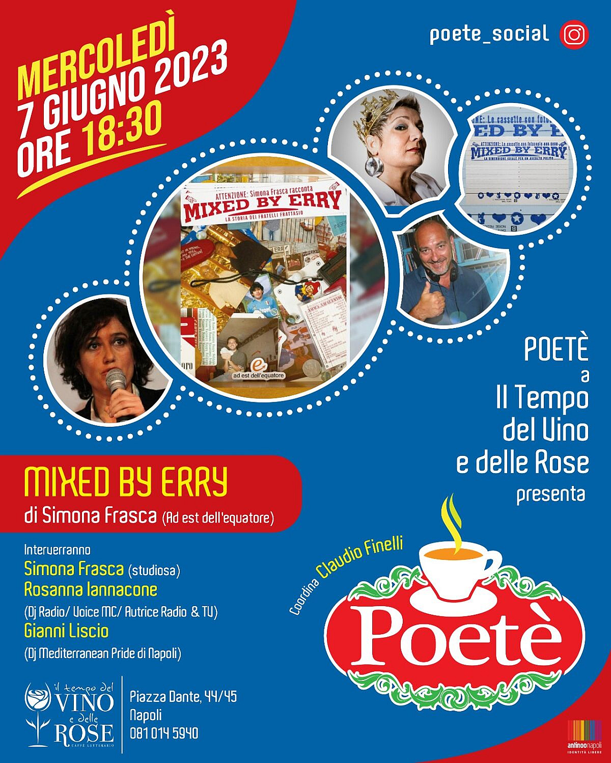Mercoledì 7 Giugno, alle ore 18,30, presso il caffè bistrot Il Tempo del Vino e delle Rose a Napoli, la rassegna letteraria Poetè, ideata e diretta da Claudio Finelli, ospita MIXED BY ERRY, il libro di Simona Frasca, docente di etnomusicologia all’università “Federico II” di Napoli, edito dalla casa editrice ad est dell’equatore, da cui è stato tratto l’omonimo film di successo diretto da Sidney Sibilia.