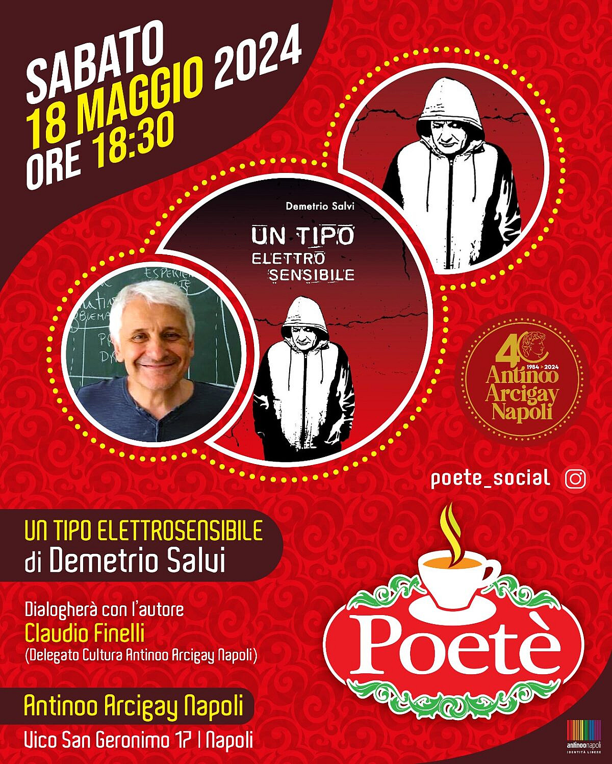 Sabato 18 Maggio, alle ore 18,30, presso la storica sede dell’associazione Antinoo Arcigay Napoli, in vico San Geronimo 17, la rassegna letteraria Poetè, ideata e diretta da Claudio Finelli, ospita UN TIPO ELETTROSENSIBILE di Demetrio Salvi,
