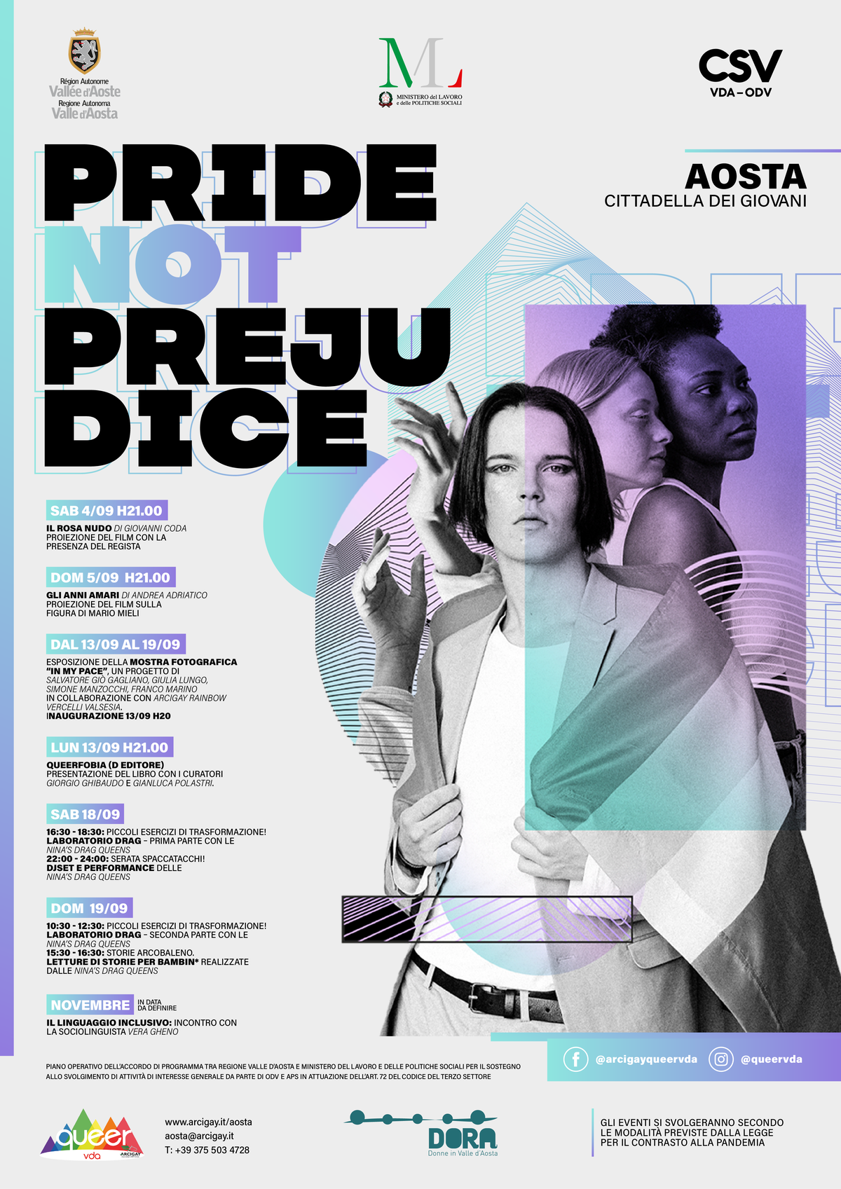 L’Associazione Arcigay Valle d’Aosta Queer VdA è felice di annunciare gli eventi del progetto Pride not prejudice, che si svolgerà tra settembre e novembre 2021 presso i locali della Cittadella dei Giovani, ad Aosta.