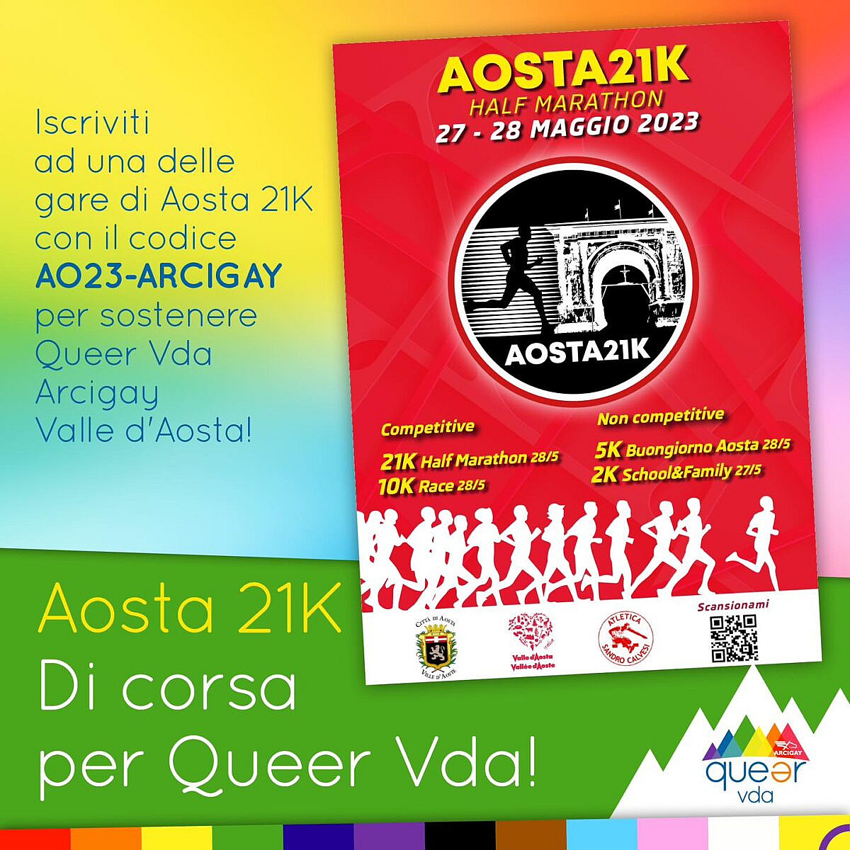 Se vuoi partecipare a qualunque delle gare previste, anche a quelle non competitive, per sostenerci e sfoggiare il pettorale con il logo di Queer VdA, iscriviti con il codice AO23-ARCIGAY sul sito www.aosta21k.com!