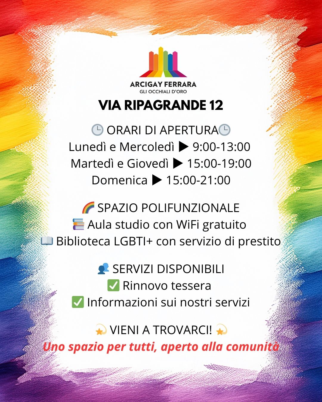 Based at Via Ripagrande 12, Arcigay Ferrara is a non-profit volunteer organization that has been committed to promoting the rights, dignity, and well-being of LGBTQIA+ people for over twenty years.