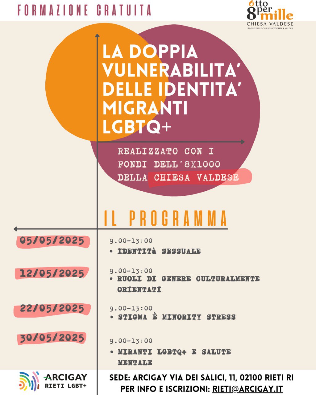 Grazie ai fondi 8X1000 della Chiesa Valdese, Arcigay Rieti organizza un ciclo di incontri di formazione gratuita, gestiti da psicologhe psicoterapeute esperte, su tematiche LGBT+ per le operatrici e gli operatori dei centri di accoglienza.