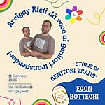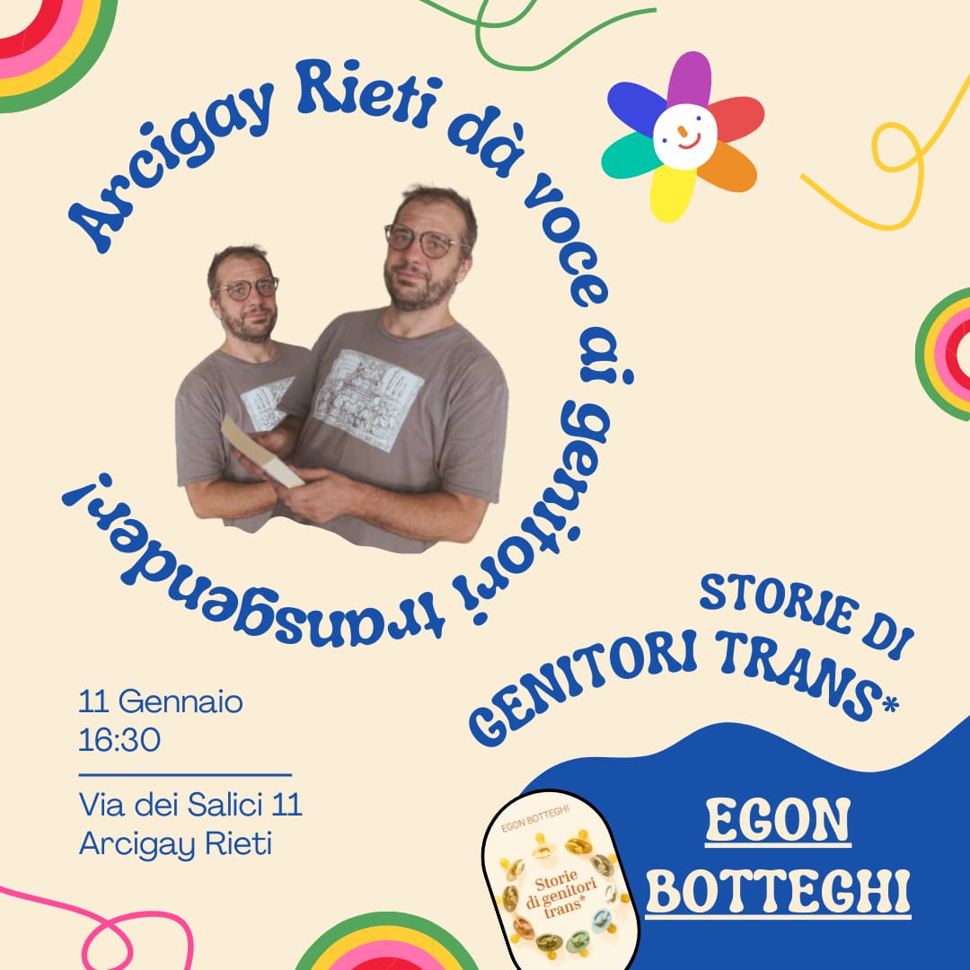 Nel 2023, Botteghi aveva presentato proprio a Rieti la guida “Trans con figli” (scaricabile gratuitamente dal sito di Rete Genitori Rainbow) contenente tanti consigli per le persone transgender con prole e per giovani persone trans* che vogliono diventare genitori nel nostro paese. Dopo il grande interesse suscitato, Egon sarà nuovamente con noi, questa volta con “Storie di genitori trans*” una raccolta di esperienze reali e straordinarie, uniche e allo stesso tempo universali in cui ogni genitore potrà ritrovarsi.