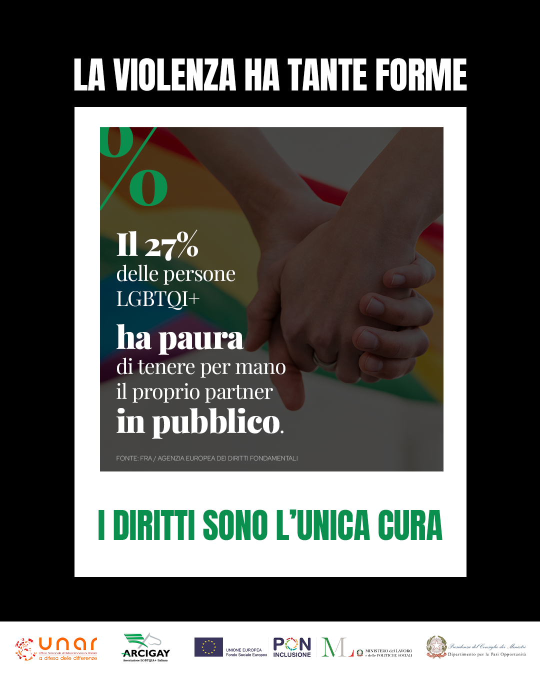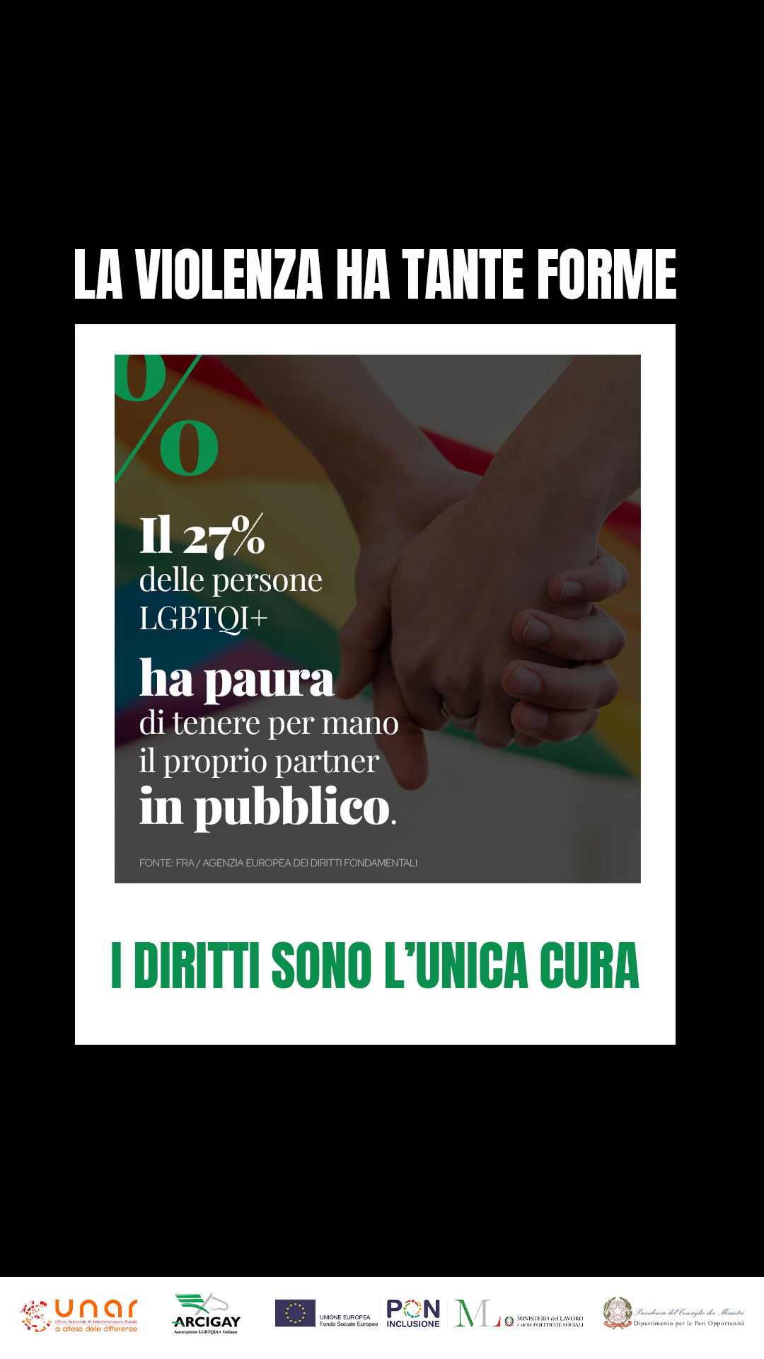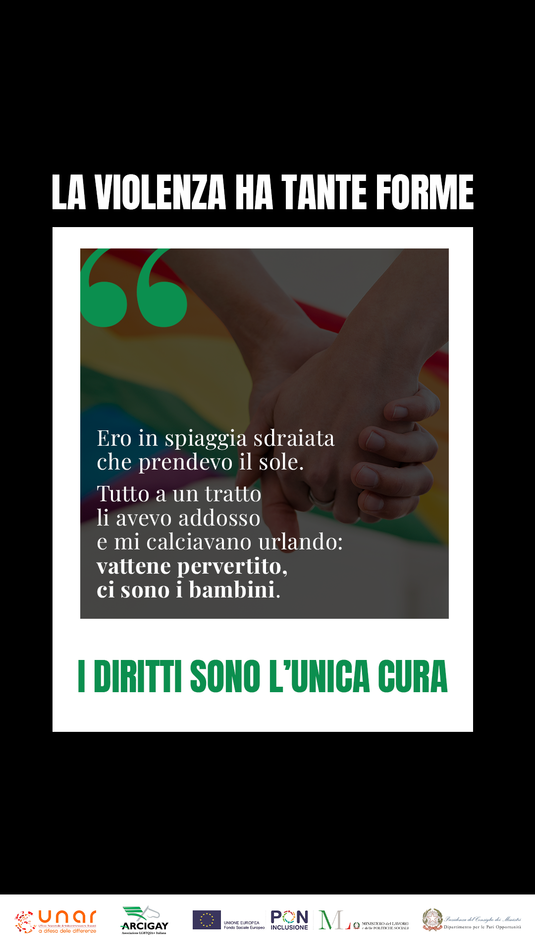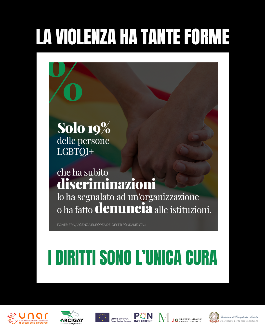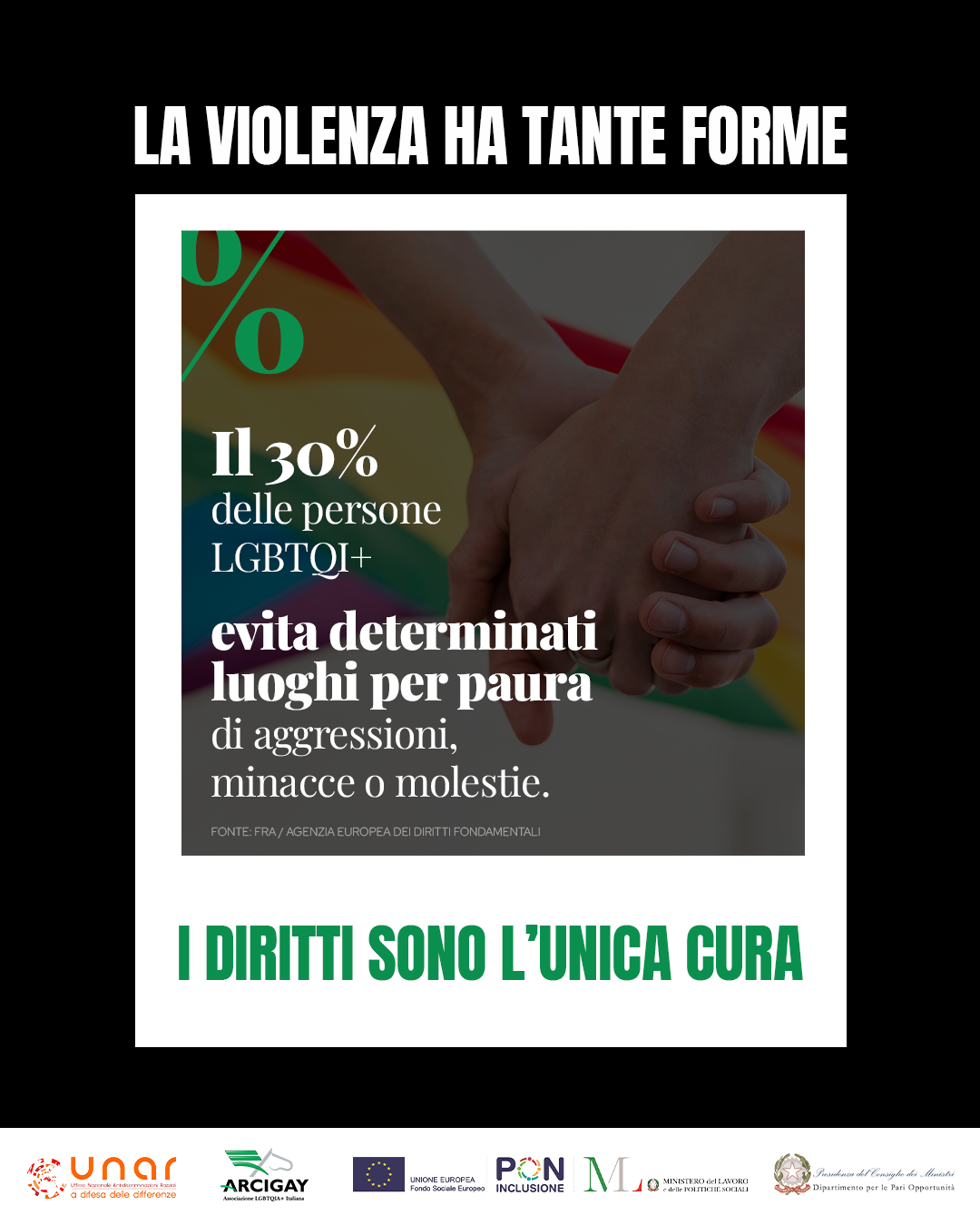 Se hai subito o pensi di aver subito una forma di violenza dovuta al tuo orientamento sessuale e alla tua identità di genere rivolgiti ai Centri Antidiscriminazione. Trova quello più vicino a te visitando la mappa.