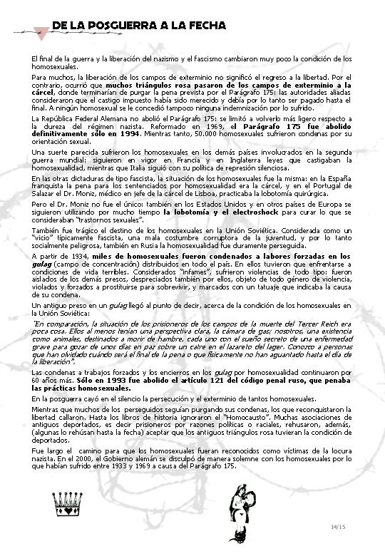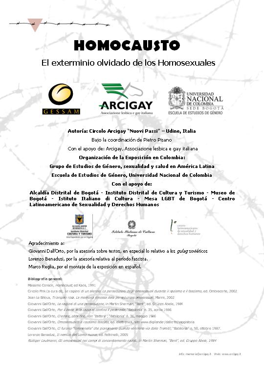 Bogot� (Colombia:)esposizione della mostra Omocausto"Omocausto" � stata realizzata da Arcigay nel 2005 (Circolo Nuovi Passi di Udine) e riproposta con aggiornamenti nel 2006 in diverse citt� italiane e a Ljubljana (Slovenja). Nella versione spagnola sono stati fatti alcuni aggiornamenti al pannello 15: L'esposizione � stata inaugurata a Bogot� (Colombia) il 15 settembre 2006.I files in formato originale sono disponibili in fondo alla pagina Panel 1