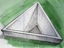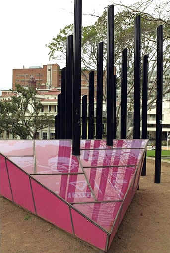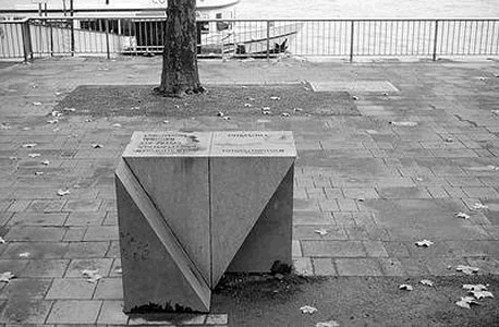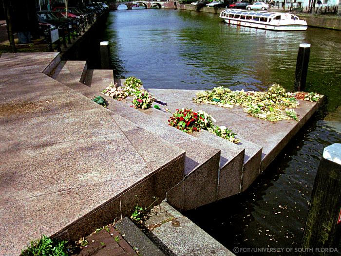 | L’opera di Karin Daan, che commemora ad Amsterdam le vittime omosessuali del Nazismo, è costituita da tre triangoli che ne definiscono uno più grande: Il primo è disegnato sul pavimento, il secondo emerge dal suolo quasi a proporre un seduta ed il terzo, è un piccolo molo che si protende sul vicino canale: la sua punta, verso l’acqua, indica la casa di Anna Frank. |