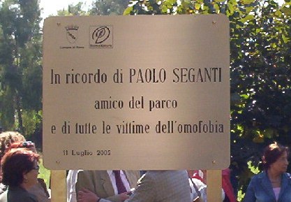 | Martedì undici ottobre 2005 è stato inaugurato un giardino in memoria di Paolo Seganti, torturato e ucciso perché gay. Il giardino sorge nel luogo in cui è avvenuta l’aggressione, in via Val D’Ala 26.Nel giardino intitolato a Paolo una targa ricorda tutte le vittime dell’omofobia. |