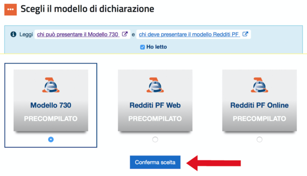 3. Rispondere alle domande relative alla scelta del modello e selezionarne uno, dopo aver spuntato la casella Ho letto, attraverso il pulsante Conferma scelta