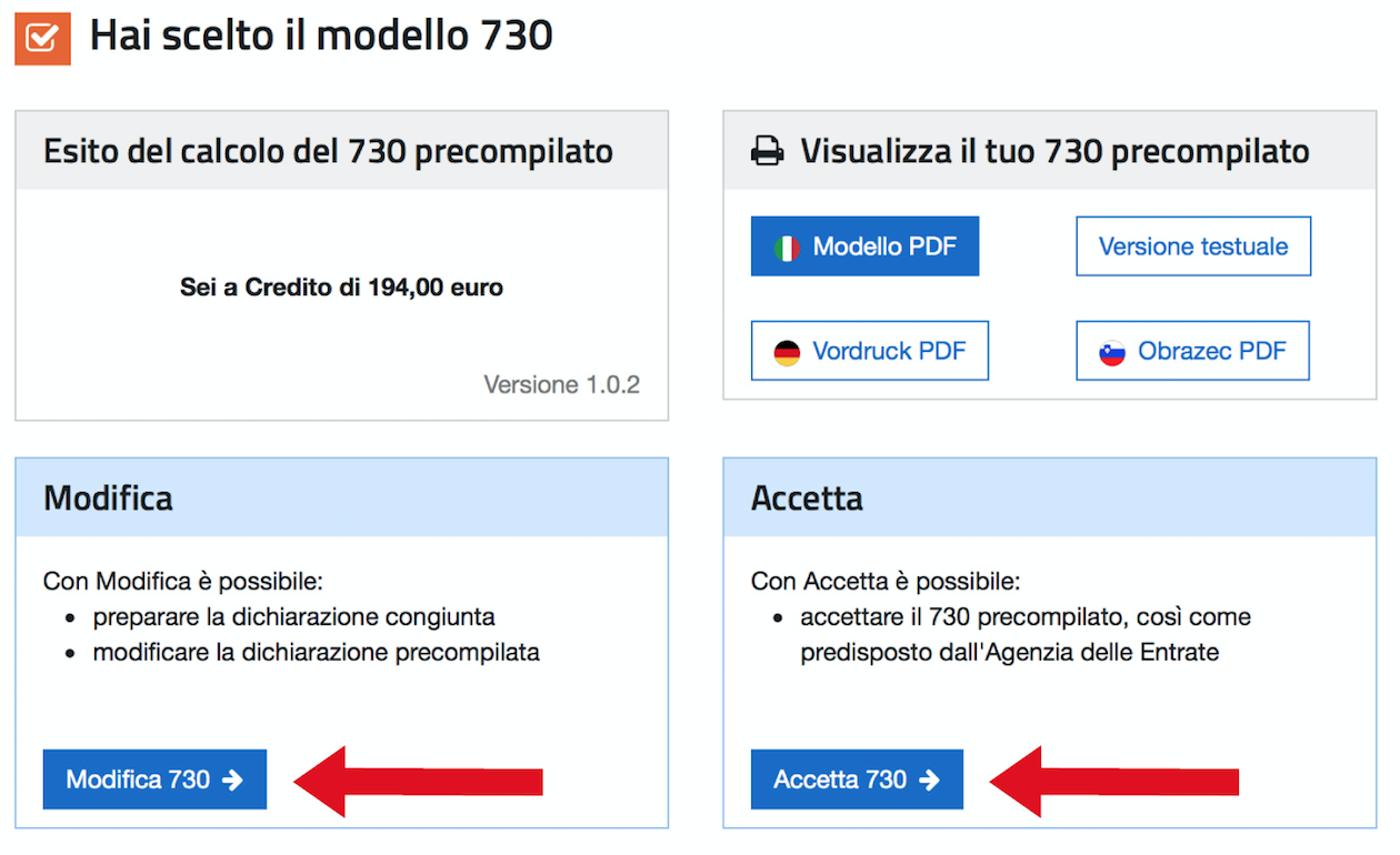 4. Selezionare Modifica 730 nel caso sia necessario apportare modifiche o integrazioni ai dati presenti nel modello precompilato oppure selezionare Accetta 730 per validare il modello e procedere alla compilazione dei campi necessari alla destinazione dei contributi dell’ 8, 5 e 2 per mille