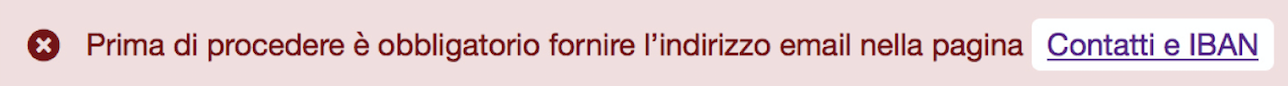 6. Nel caso compaia un messaggio di errore sarà necessario procedere all’ inserimento dei propri contatti cliccando sull’ apposito link Contatti e IBAN