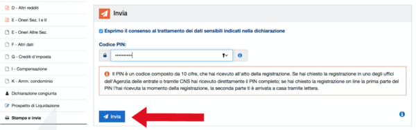 8. Dalla colonna di sinistra selezionare la voce Stampa e invia per procedere alla conferma definitiva delle scelte effettuate. A seconda del metodo di autenticazione (SPID, ENTRATEL, CNS) utilizzato per accedere alla piattaforma sarà necessario confermare con pin o password e cliccare sul bottone Invia per concludere la procedura